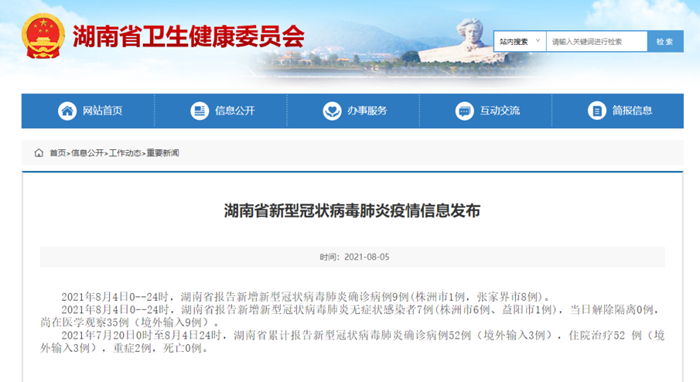 2021年8月4日0--24时,湖南省报告新增新型冠状病毒肺炎确诊病例9例(株洲市1例,张家界市8例)。