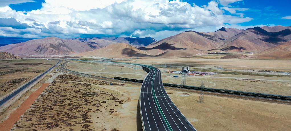 在京藏高速那曲至羊八井段,火车穿过由中铁二局承建的跨青藏铁路特大桥(2021年5月30日摄,无人机照片)。 新华社记者刘洪明 摄
