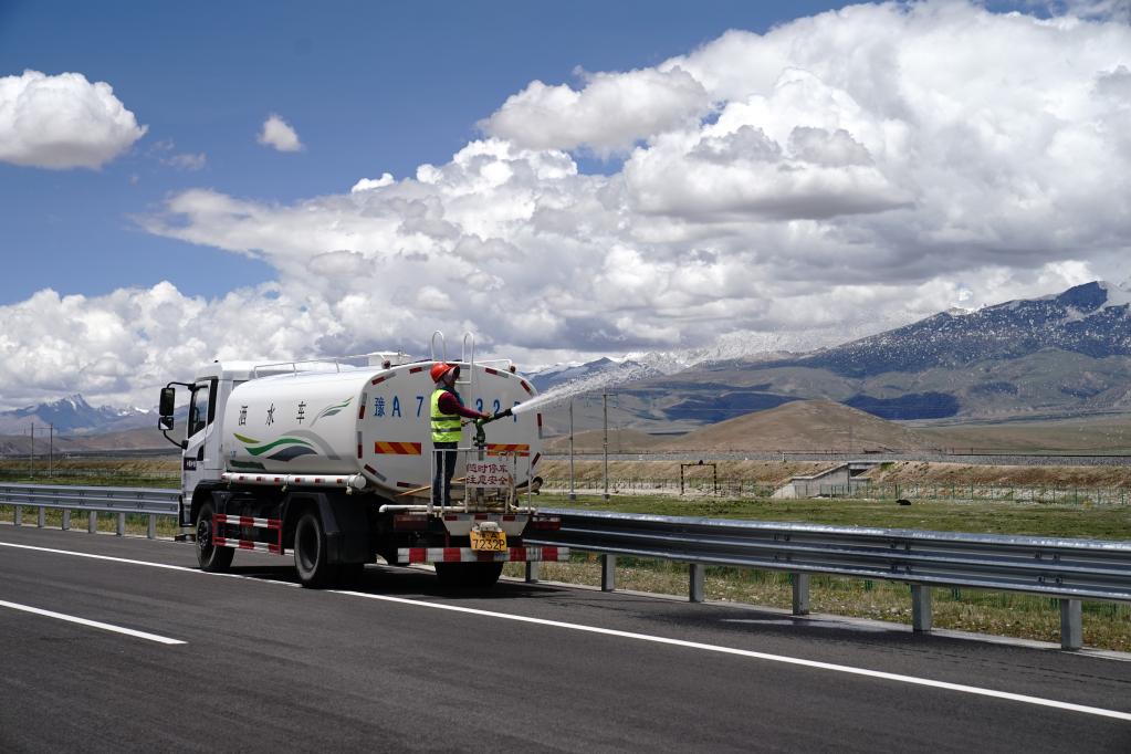 工人正在京藏高速那曲至羊八井段为路边绿化植被洒水(2021年6月28日摄)。 新华社记者刘洪明 摄