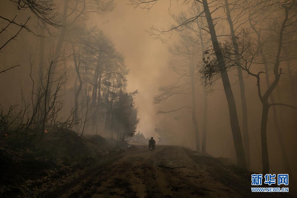 8月5日,在希腊埃维亚岛,山火产生的烟雾笼罩道路。新华社发(莱夫泰里斯·帕特萨利斯摄)