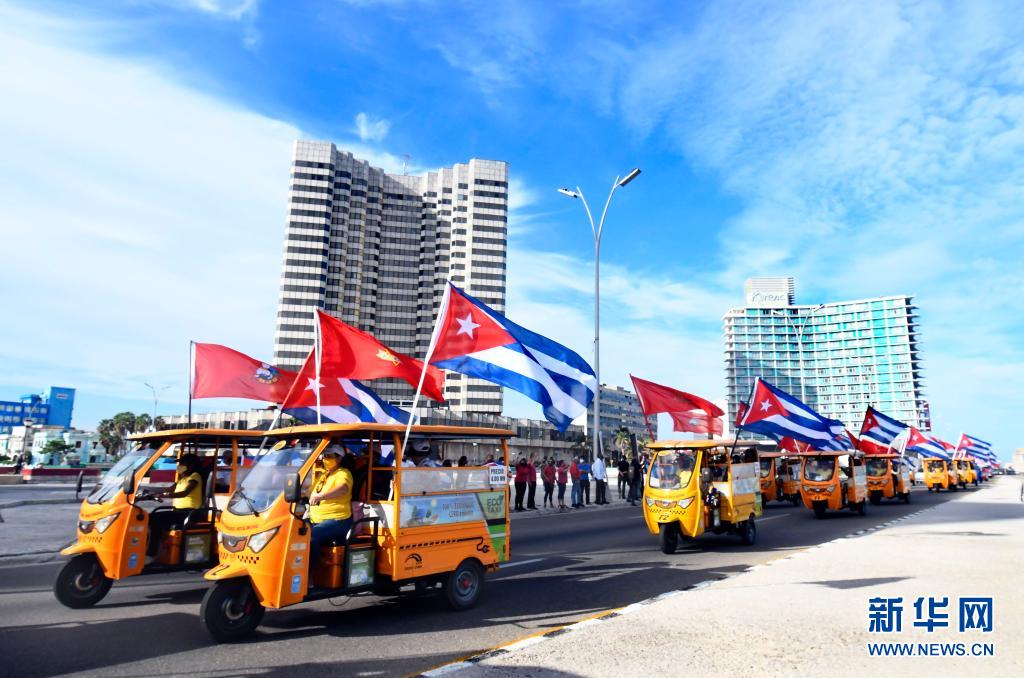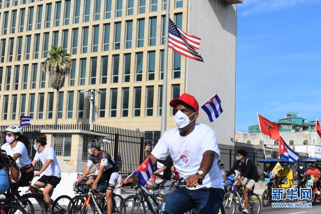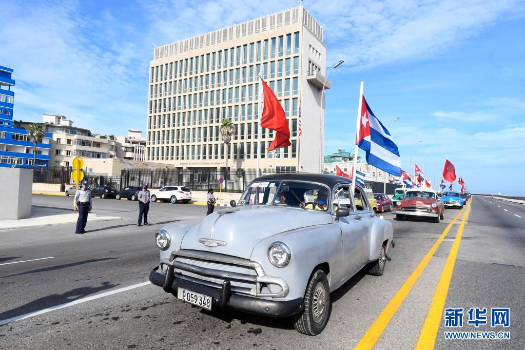 8月5日,在古巴首都哈瓦那,参加游行的车辆从美国驻古巴大使馆前驶过。新华社发(华金·埃尔南德斯摄)