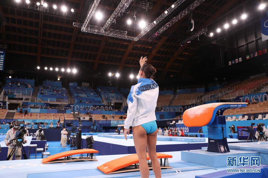7月25日,46岁的乌兹别克斯坦体操名将丘索维金娜在比赛后向观众致意。新华社记者曹灿摄