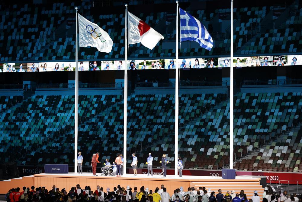 8月8日,第32届夏季奥林匹克运动会闭幕式在日本东京举行。这是志愿者代表接受国际奥委会运动员委员会新委员致意。(新华社记者 王丽莉摄)