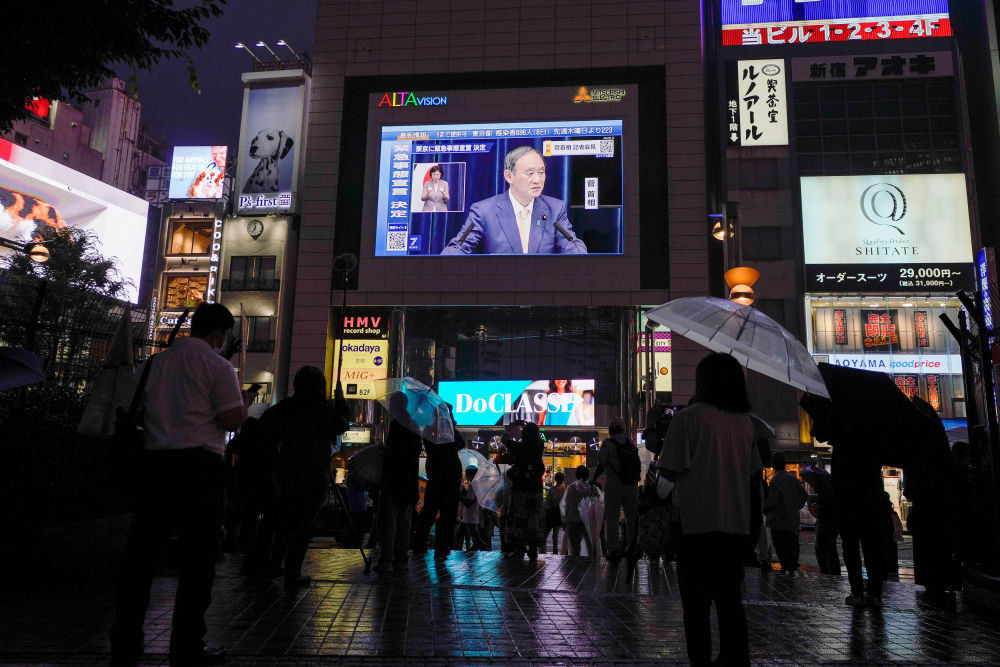 7月8日,日本东京的一块电子屏幕上播放日本首相菅义伟宣布东京都将再次进入紧急状态的新闻发布会画面。(新华社发,克里斯托弗·朱摄)