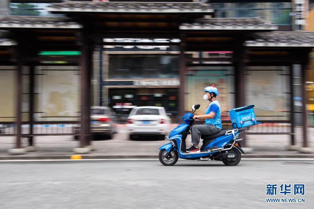 8月9日,在张家界永定区永定街道,外卖员燕赢召在骑车送外卖的路上。