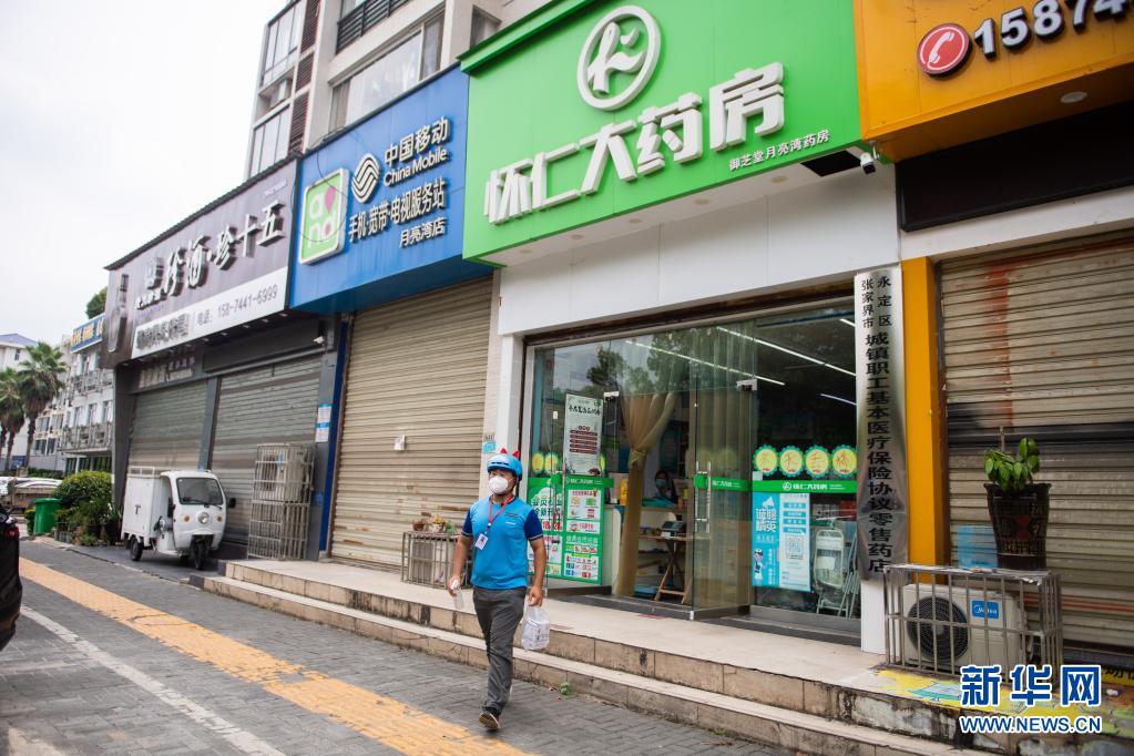 8月9日,在张家界永定区一家药房,外卖员燕赢召取上药品外卖后离开。