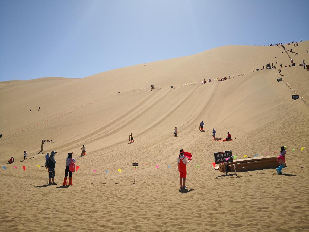 8月6日,游客在甘肃敦煌鸣沙山月牙泉景区内游玩。 受访者供图