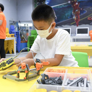 8月4日,在深圳市少年宫暑期科技班,12岁的钟智彬在电脑上学习编程。他的妈妈李春梅在达聆社会工作服务中心工作,疫情期间负责组织社工分赴核酸检测点,配合医护人员进行核酸检测筛查工作。