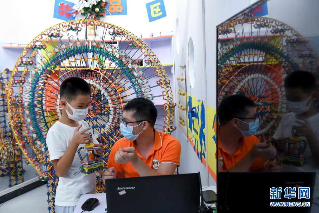 8月4日,在深圳市少年宫暑期科技班,11岁的许梓轩(左)向老师请教“露营灯”的编程。他的母亲屈春兰是宝安区永丰社区的一名义工。