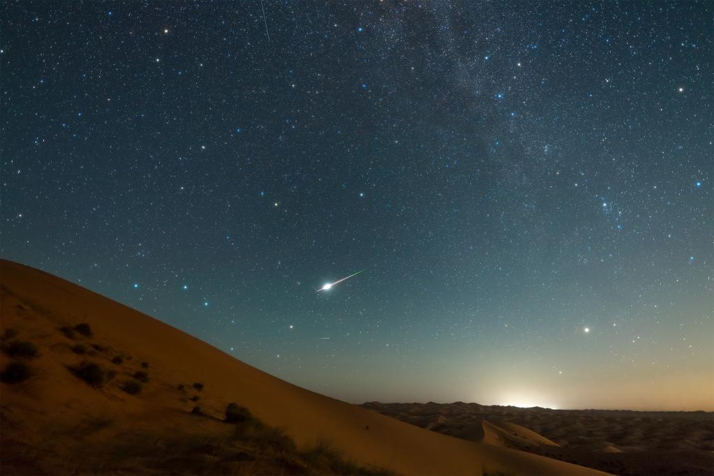内蒙古自治区天文爱好者郑晓进2020年8月13日在内蒙古腾格里沙漠拍摄到的英仙座流星雨。(星联CSVA供图)