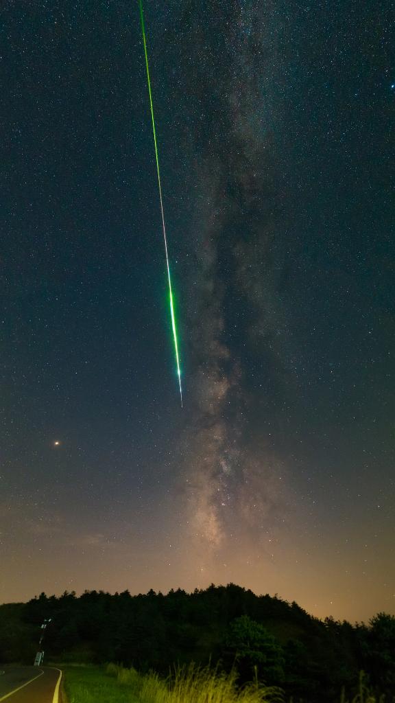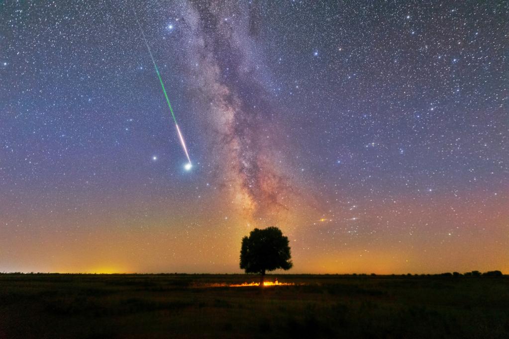 河南省天文爱好者路冠中2020年8月9日在平顶山市宝丰县拍摄到的英仙座流星雨中的火流星划过“直立银河”。(星联CSVA供图)