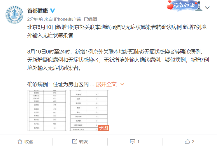 北京8月10日新增1例京外关联本地新冠肺炎无症状感染者转确诊病例 新增7例境外输入无症状感染者