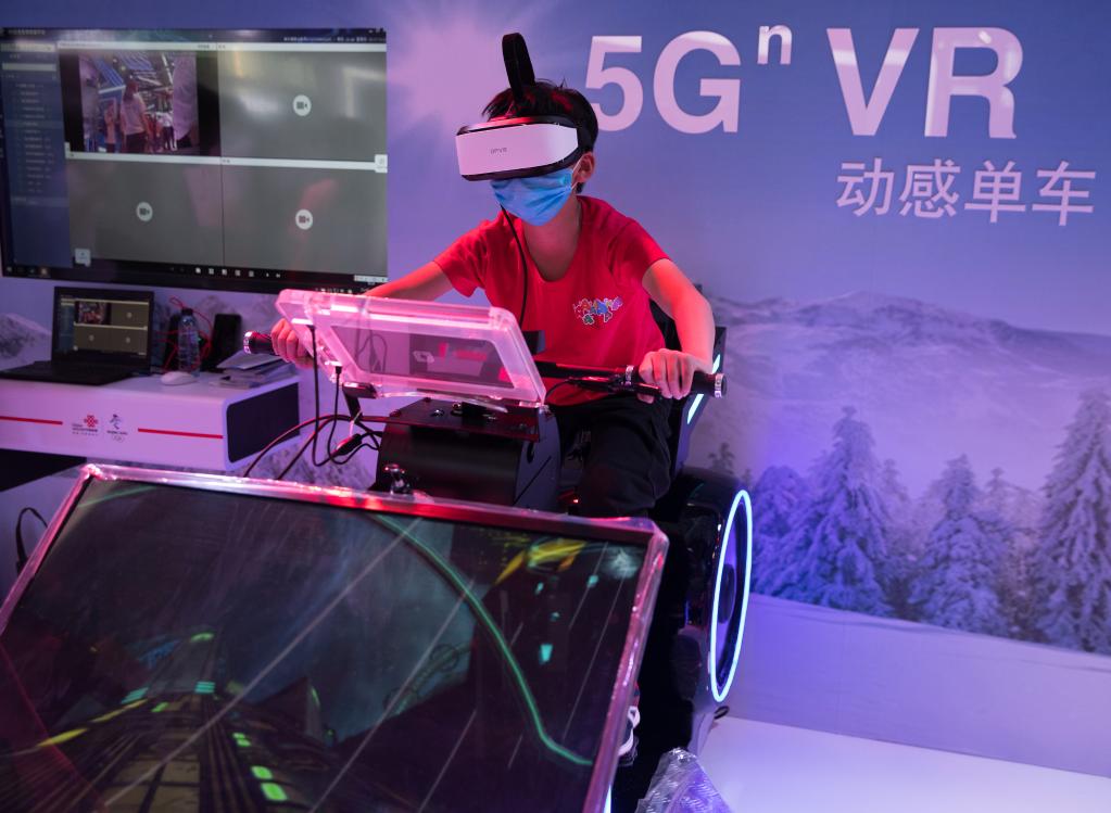 在2021中国国际大数据产业博览会展馆,观众体验5G虚拟现实动感单车。新华社记者 金立旺 摄