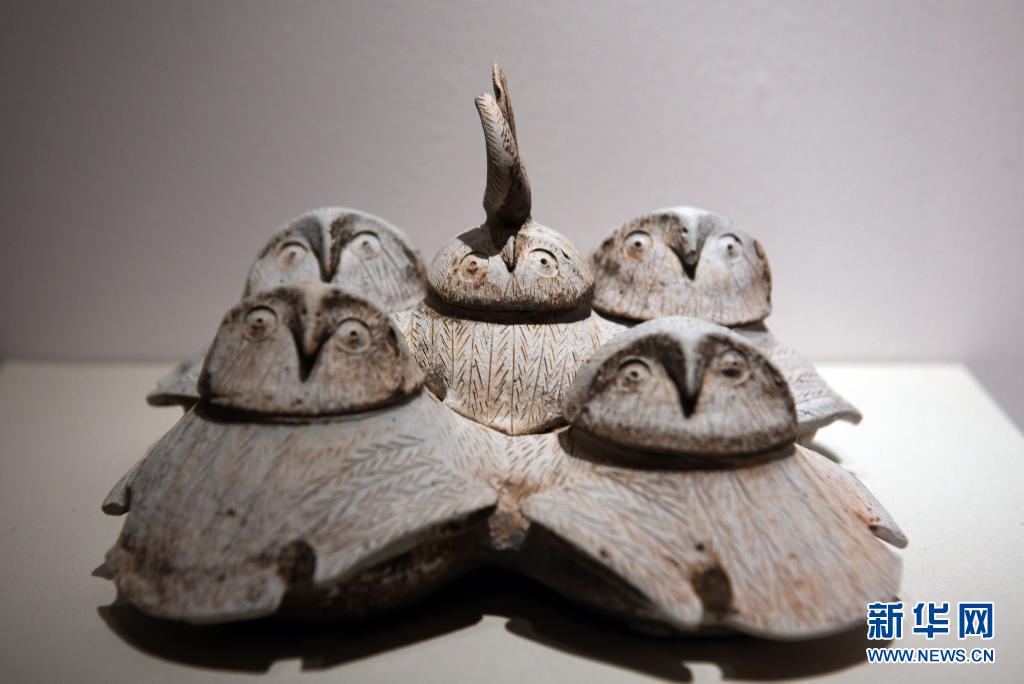 这是展出的陶鸮形五联罐(8月10日摄)。 新华社记者 金良快 摄