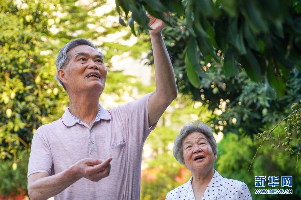 麦贤得与老伴李玉枝在小区里散步(5月22日摄)。新华社发(栾铖 摄)