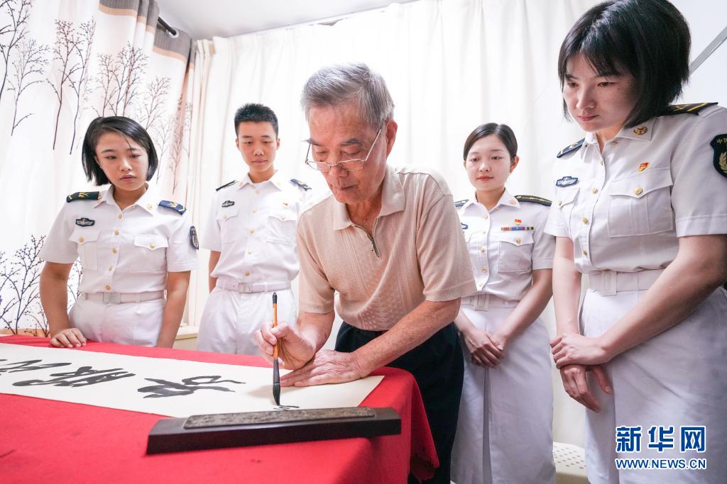 麦贤得为来家中探望他的官兵题写“为人民服务”(5月21日摄)。新华社发(栾铖 摄)