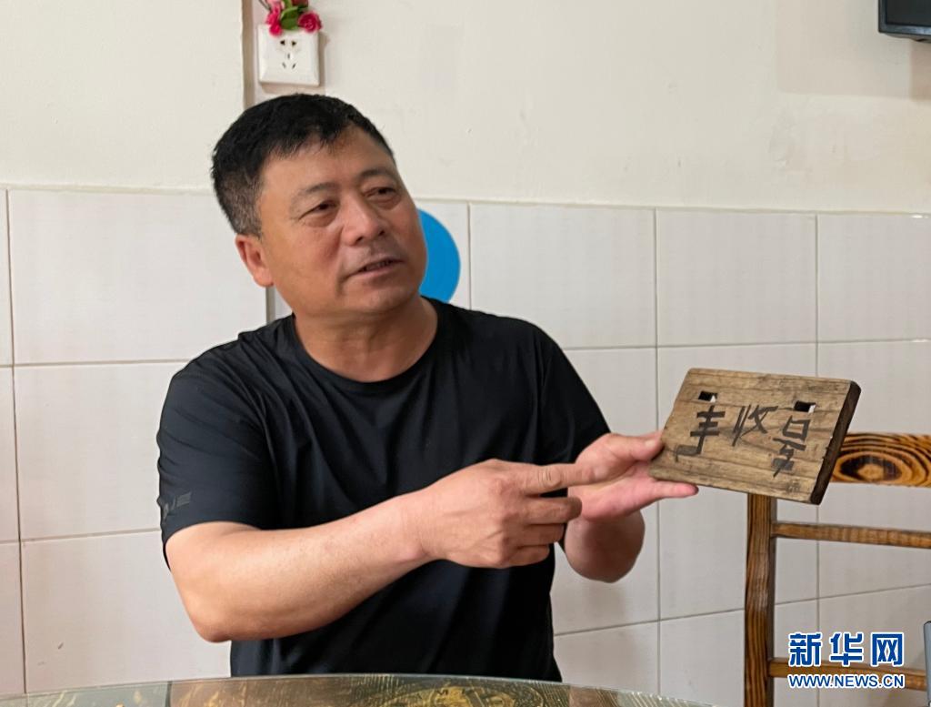 湖南省沅江市退捕渔民彭正军把昔日自家渔船“丰收号”船名牌收藏在店里留作纪念(5月13日摄)。在沅江,他开的“小彭之家鱼馆”宾客如云。新华社记者 苏晓洲 摄