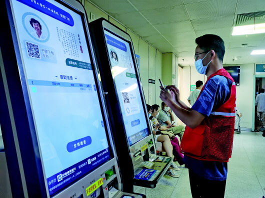 王中原正在天津市一家医院门口扫码登记。 记者白佳丽摄