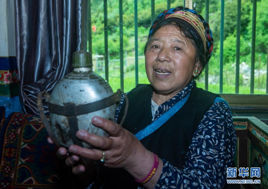 太昭村村民阿牛在展示当年解放军送给她父亲的水壶(7月9日摄)。新华社记者 旦增尼玛曲珠 摄