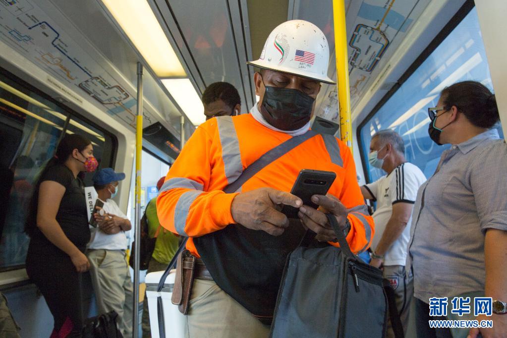 8月11日,在美国佛罗里达州迈阿密,一名戴口罩的男子在地铁上查看手机。