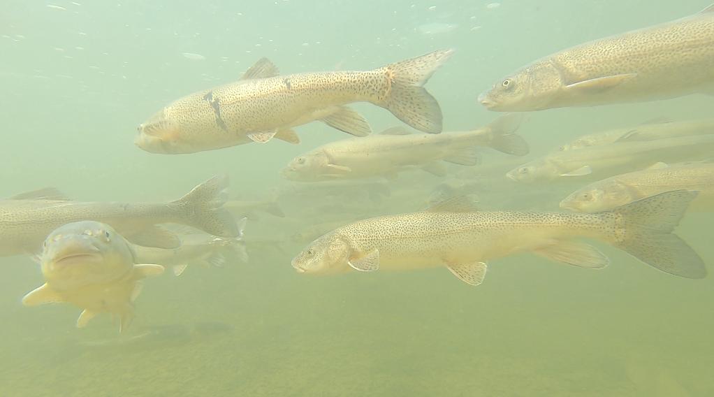 这是在长江源使用水下相机拍摄的自然条件下小头裸裂尻鱼繁殖群体。