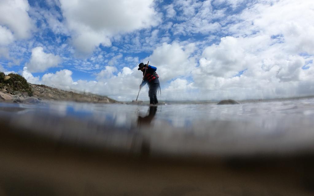 在青海省玉树藏族自治州治多县,长江科学院高级工程师李伟在科欠曲采集鱼类样本。(新华社记者 吴刚 摄)