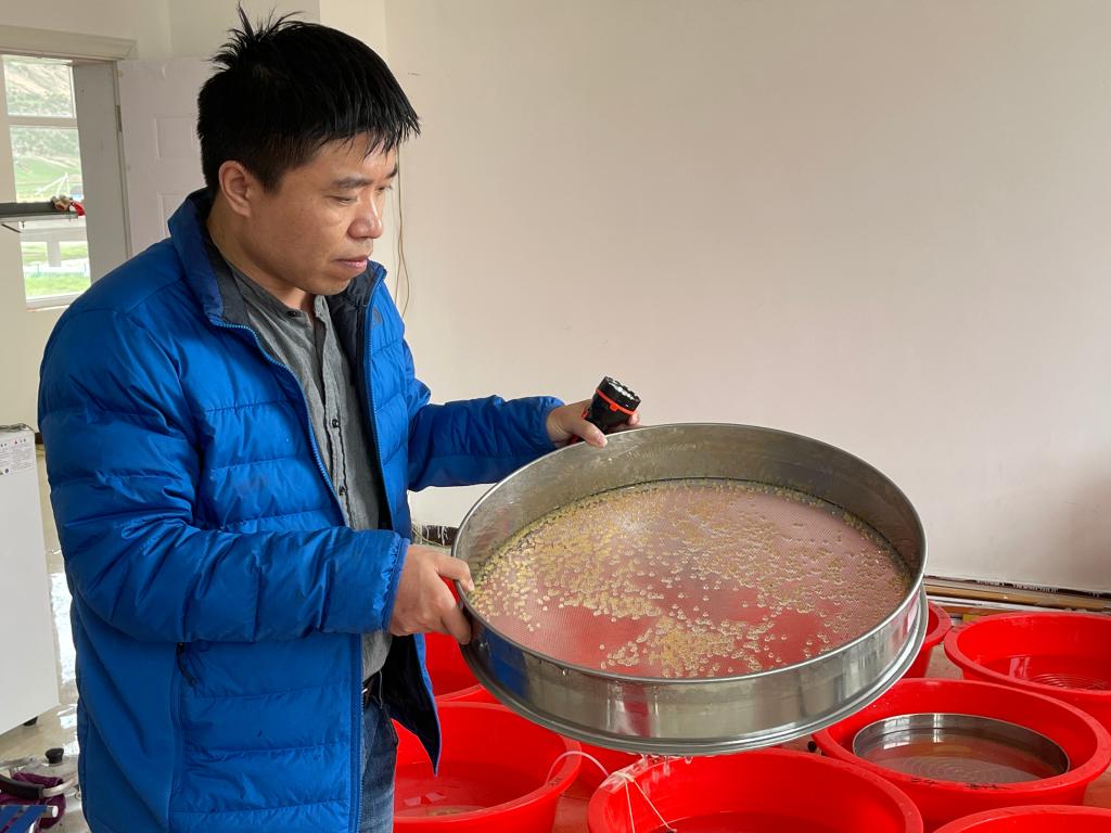 李伟正在查看孵化中的长江源关键鱼类受精卵(6月23日摄)。