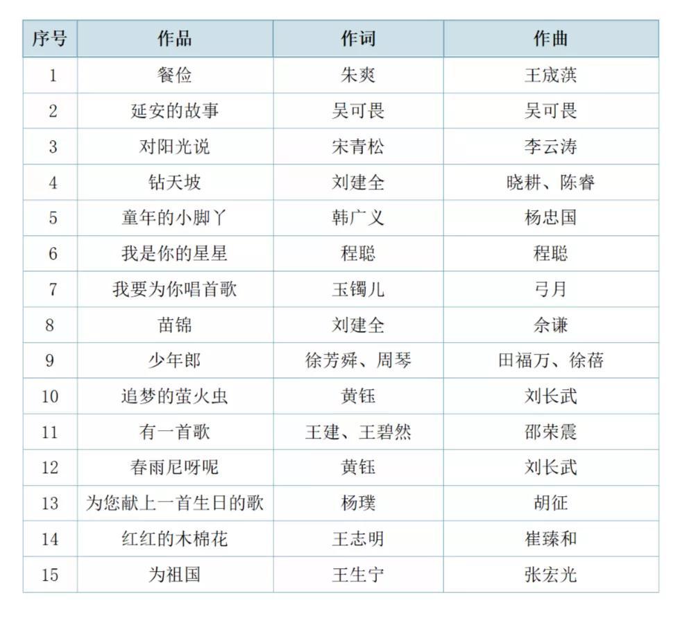 经过初审和复审,共有48首进入终审环节。最终,专家评审们依据“公平、公正、公开”的纪律和标准,从进入终审的48首作品中精选出15首优秀歌曲如下(排名不分前后):