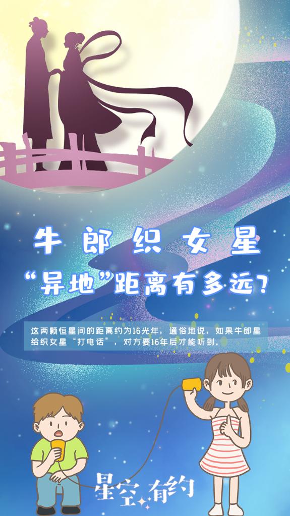 王科超解释说,牛郎星、织女星是两颗恒星,这两颗恒星间的距离约为16光年。“通俗点解释,光一年‘走过’的路程为一光年,也就是说,牛郎星给织女星‘打电话’,对方要16年后才能听到。”