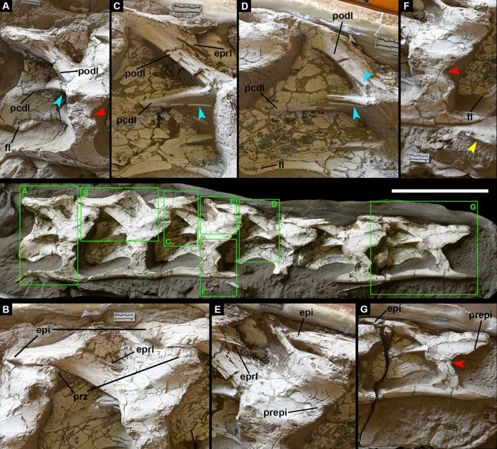 据介绍,中国丝路巨龙6节颈椎的长度约3米,保守估计其体长超过20米;新疆哈密巨龙的单个尾椎长度在210毫米至320毫米不等,保守估计体长约为17米。与中国丝路巨龙保存在一起的还有一块残破的哈密翼龙下颌,说明这些大型恐龙与哈密翼龙共同生活在约1.3亿年至1.2亿年前白垩纪的天空和陆地上。