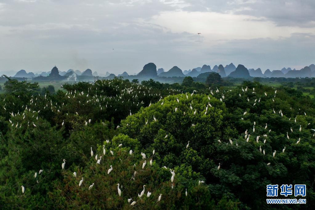 近年来,广西桂林市临桂区坚持经济发展与生态保护相结合,积极践行“绿水青山就是金山银山”理念,统筹山水林田湖草沙系统治理。经过努力,生态环境持续改善。在临桂区四塘镇王家村,自2019年起,便有白鹭、池鹭、牛背鹭、夜鹭等鸟类陆续来此筑巢繁衍,鹭鸟成为乡间的一道风景。