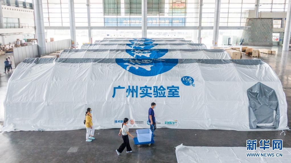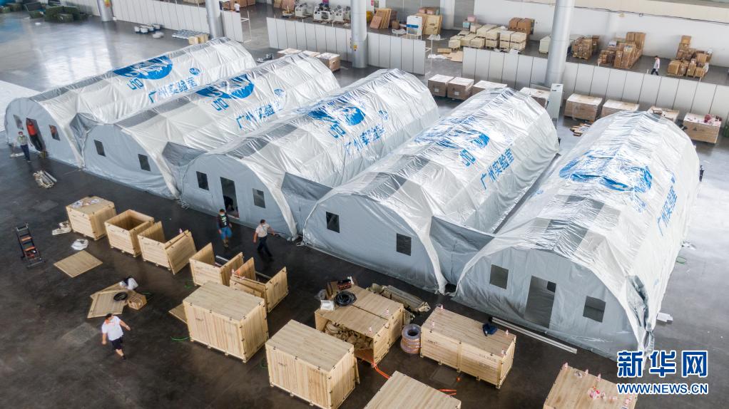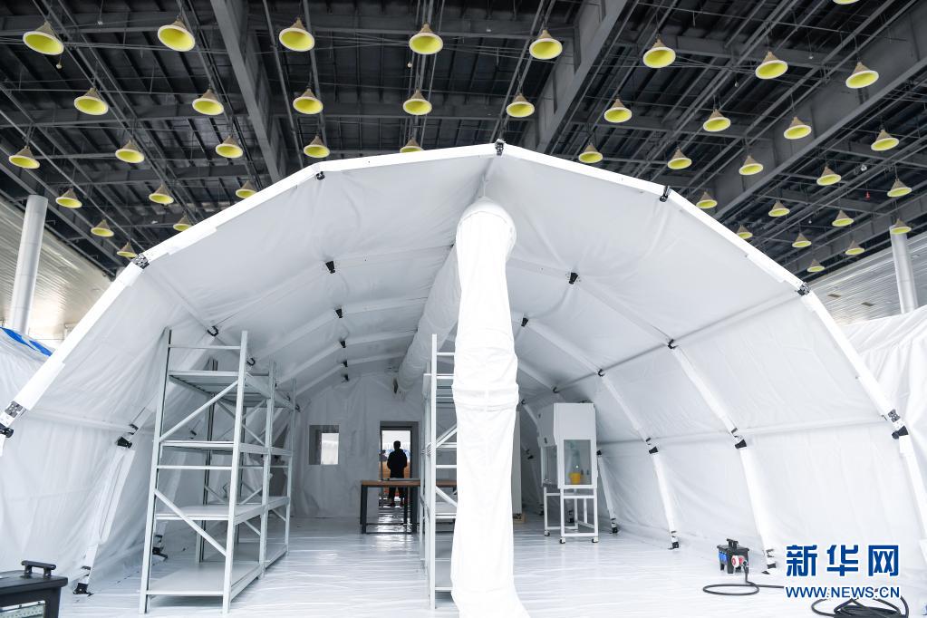 8月10日在江苏扬州国际展览中心拍摄的搭建中的“猎鹰号”硬气膜实验室。新华社记者 李博 摄