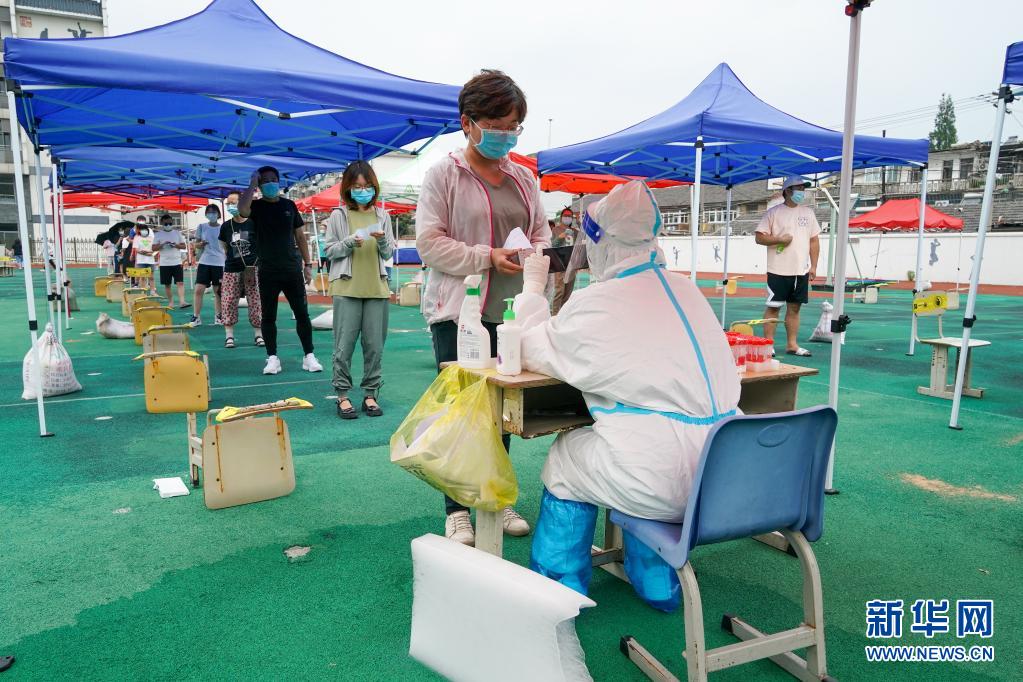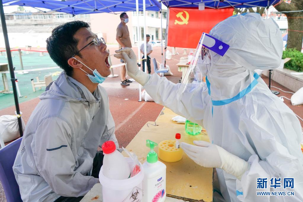 市民在扬州市广陵区汶河街道龙头关社区育才小学采样点进行核酸检测取样(8月9日摄)。新华社记者 李博 摄