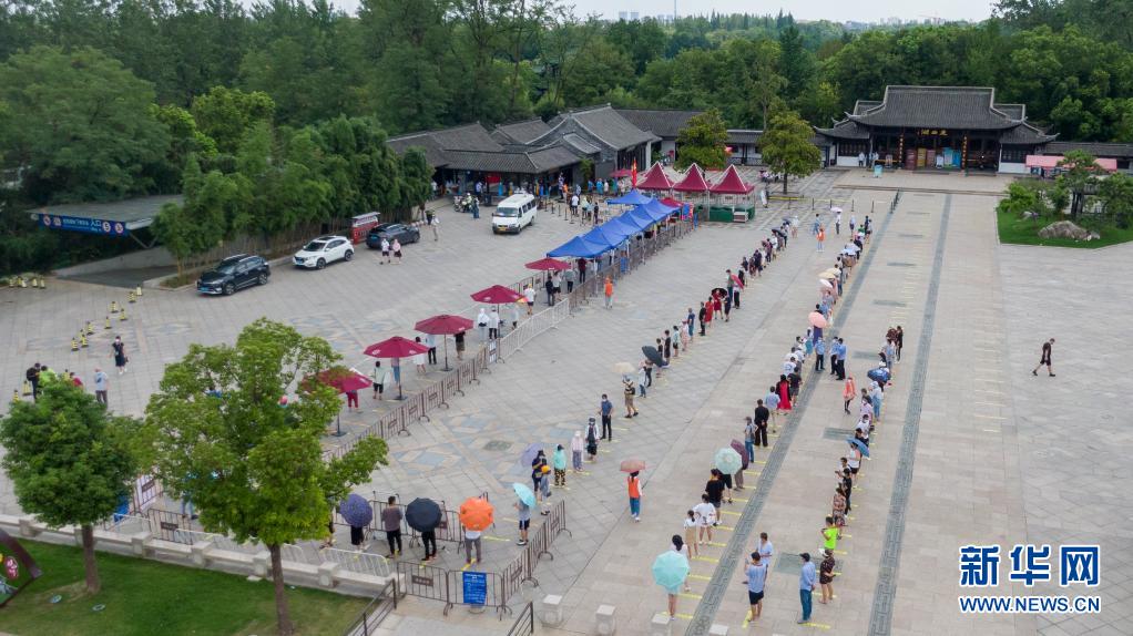 市民在扬州市瘦西湖街道五亭社区瘦西湖西门采样点排队,准备进行核酸检测(8月7日摄)。新华社记者 李博 摄