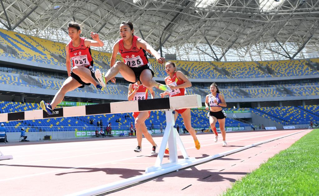 4月28日,在陕西西安举行的第十四届全国运动会田径项目测试赛暨2021年田径分区邀请赛(西北赛区)女子组3000米障碍决赛中,甘肃队选手田万花(前右)以10分29秒09的成绩获得冠军。新华社记者李一博 摄