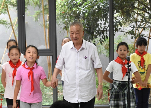 2018年9月20日,爱心人士与南京大屠杀幸存者共迎中秋。参加活动的小学生邀请南京大屠杀幸存者葛道荣(中)一起唱歌。 新华社记者孙参 摄