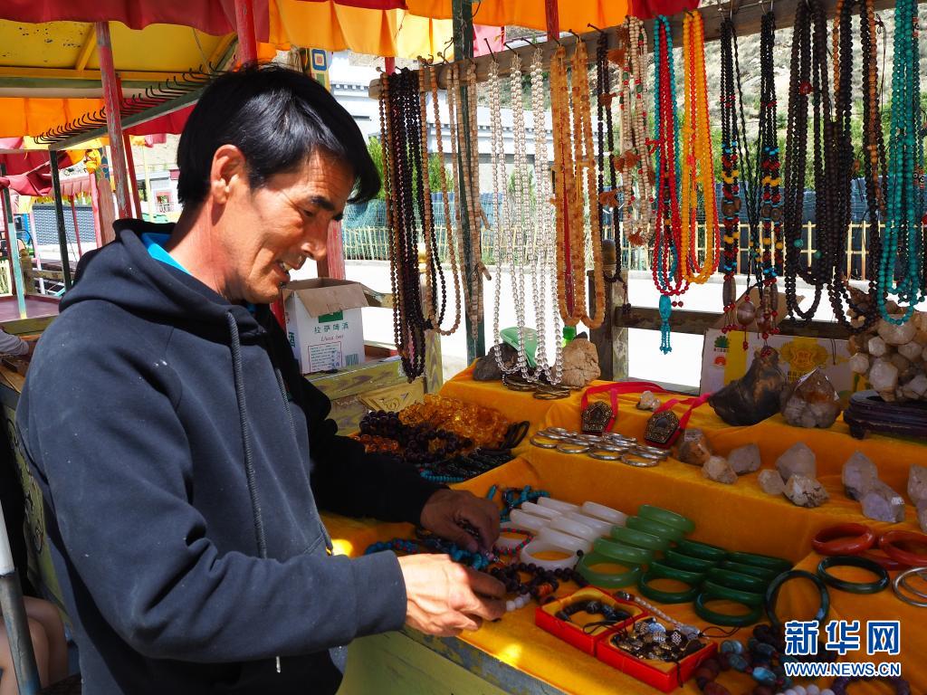 西藏山南市乃东区门中岗社区居民顿珠白玛在自己的工艺品摊位上(6月24日摄)。新华社记者 金一清 摄