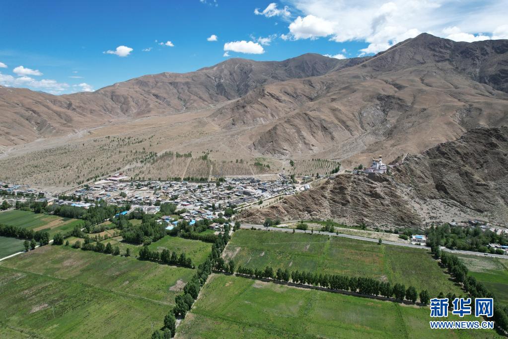 远眺雍布拉康和门中岗社区(无人机照片,6月24日摄)。新华社记者 司源 摄