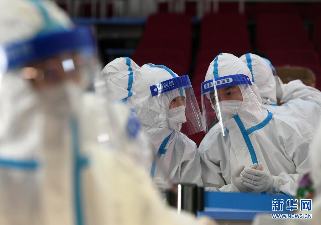 8月15日,在郑州市经八路街道办事处文联社区检测点,医护人员在核酸检测取样间隙交流。