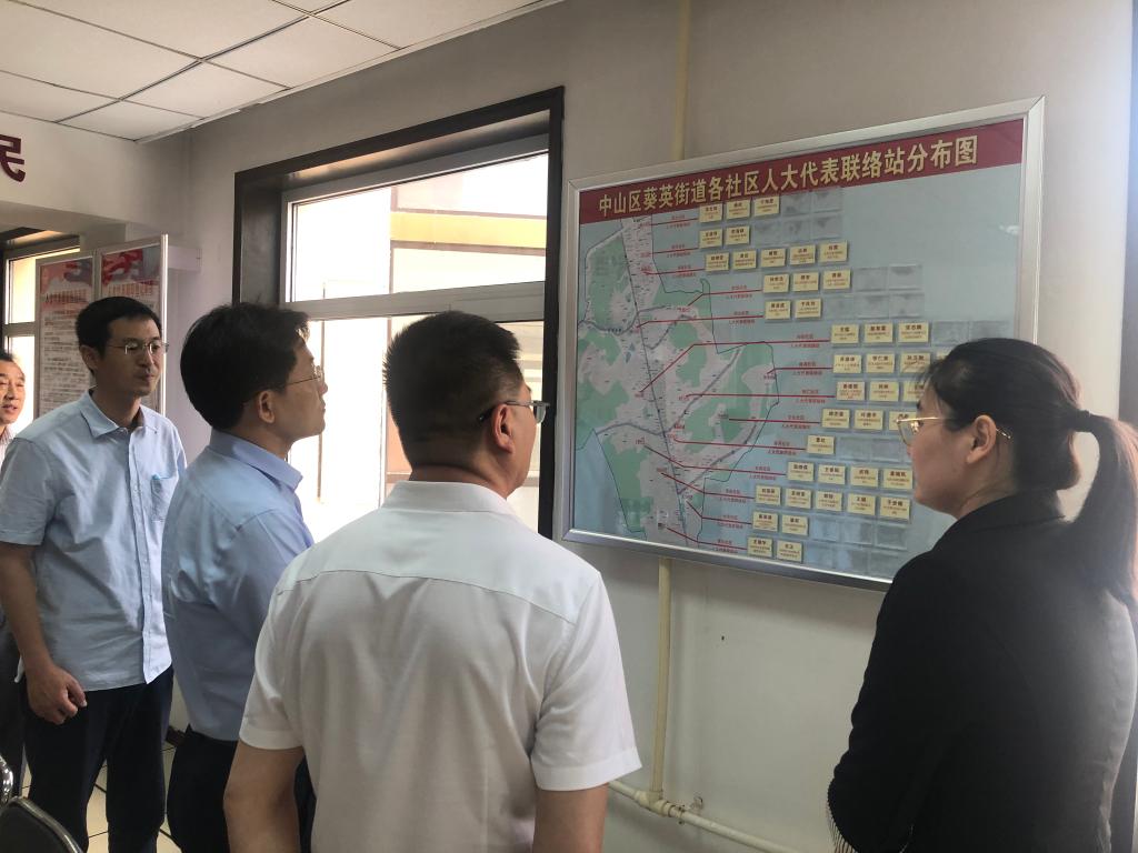 大连市人大常委会工作人员在中山区葵英街道的人大代表之家查看代表联络站分布图。(图片由大连市人大常委会提供)