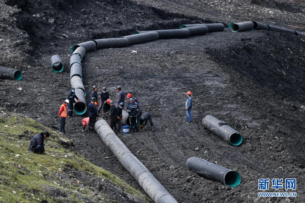 8月16日,救援人员在青海柴达尔煤矿冒顶事故救援现场铺设排水管道。新华社记者 吴刚 摄