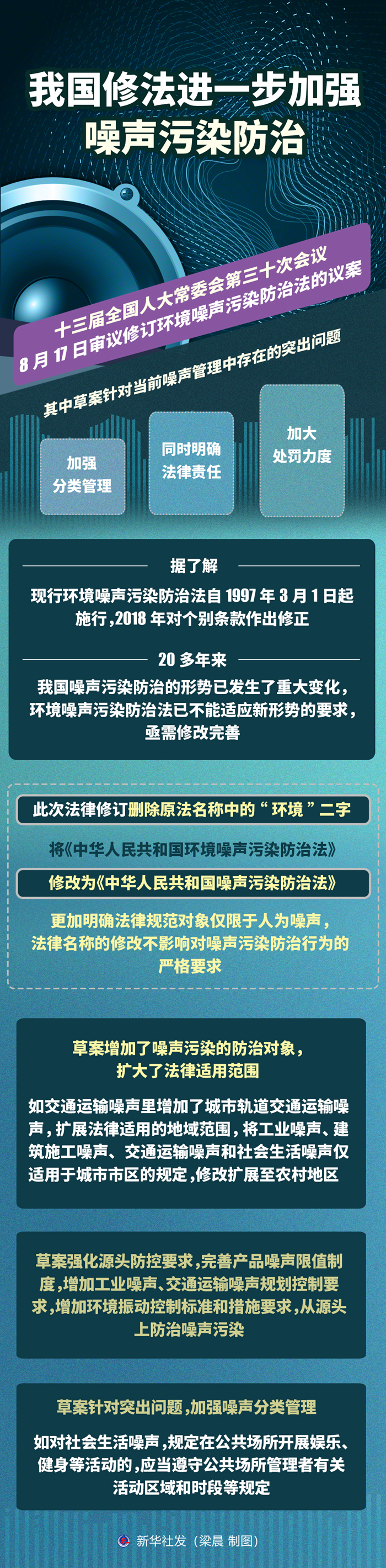 新华社北京8月17日电(记者高敬)噪声污染与人民群众息息相关,越来越成为社会和广大人民群众关心的问题。十三届全国人大常委会第三十次会议17日审议修订环境噪声污染防治法的议案。其中草案针对当前噪声管理中存在的突出问题,加强分类管理,同时明确法律责任,加大处罚力度。