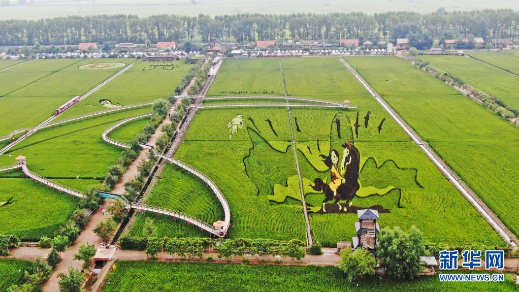 近日,辽宁省沈阳市沈北新区锡伯龙地创意农业产业园的稻田画进入观赏期,多种色彩的水稻组成稻田画,吸引众多游人前来观光体验。