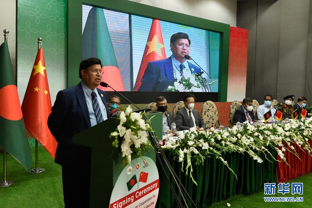 8月16日,孟加拉国外长莫门(左一)在达卡举行的签署仪式上讲话。新华社发