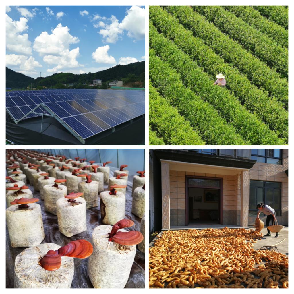 拼版照片:左上图为大湾村中的光伏电站。左下图为光伏板下种植的灵芝。