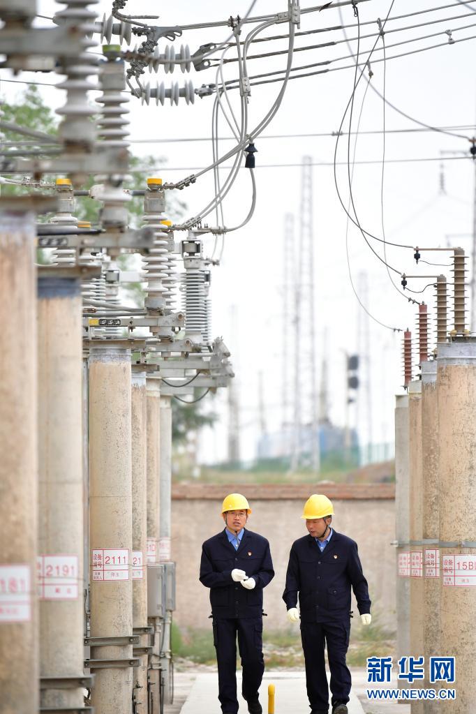 8月17日,石瑾(左)和同事在变电所内巡视。新华社记者 杜哲宇 摄