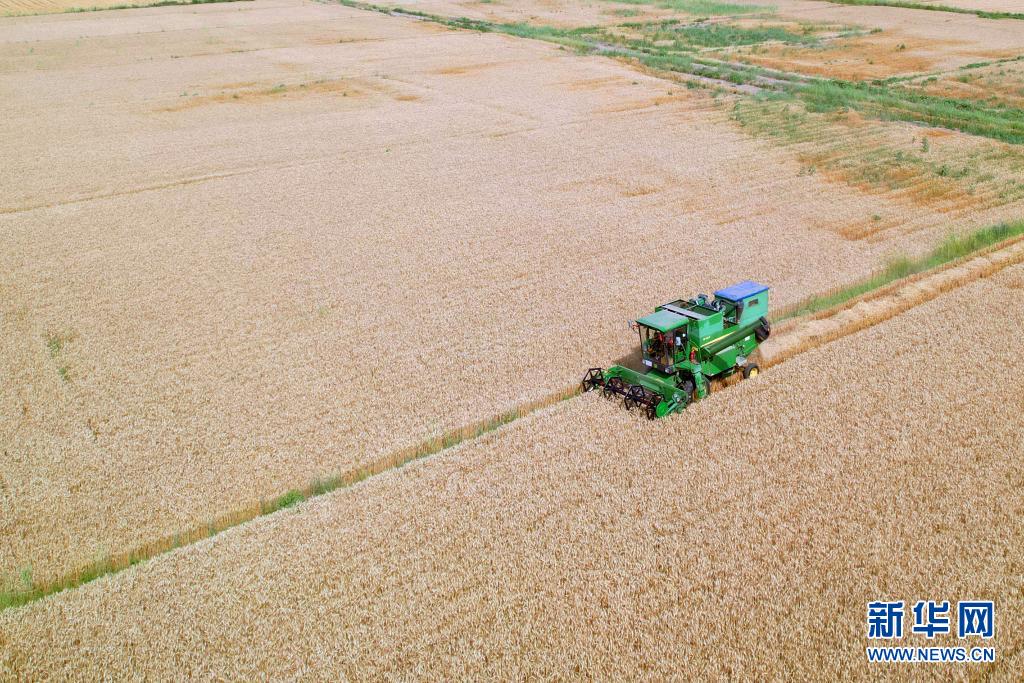 7月29日,在内蒙古巴彦淖尔市临河区小麦种植基地,收割机正收获小麦(无人机照片)。新华社记者 李云平 摄