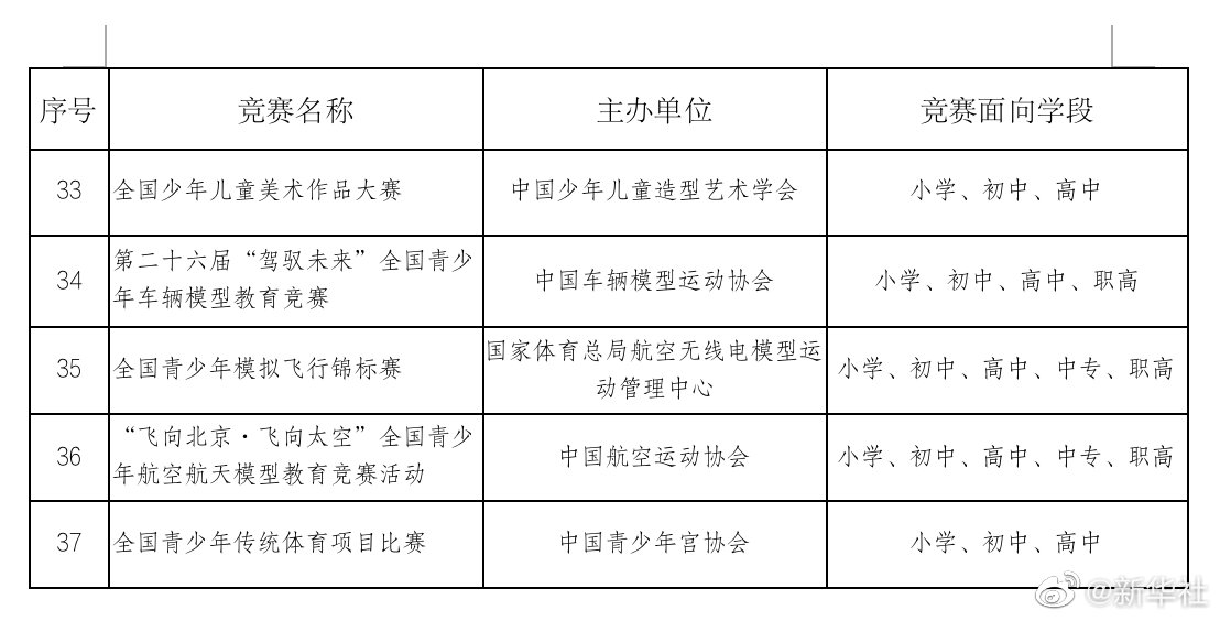 记者18日从教育部了解到,教育部拟确定全国青少年人工智能创新挑战赛等37项竞赛,为2021至2022学年面向中小学生开展的全国性竞赛活动,举办时间原则上为2022年8月前。现教育部办公厅正就相关信息进行公示。根据教育部相关规定,面向中小学生的全国性竞赛活动实行清单管理制度,清单每年动态调整一次。竞赛以及竞赛产生的结果不作为中小学招生入学的依据。(记者胡浩)