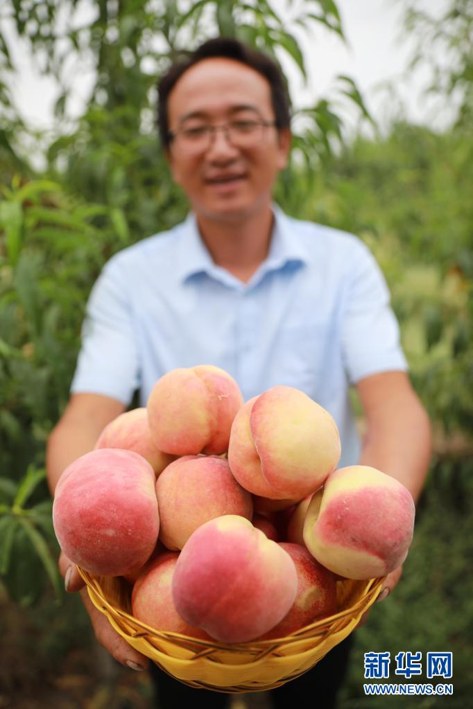 8月18日,方志利展示刚采摘的桃子。新华社记者 杜哲宇 摄