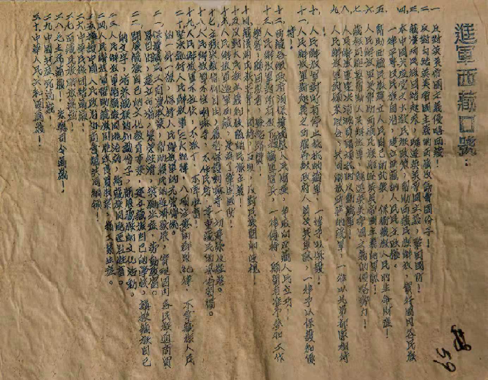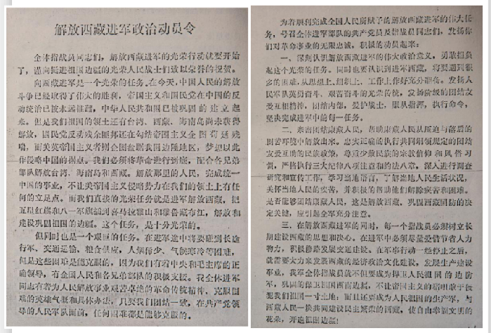 顺着西藏和平解放的历史脉络,我查到了这样几份档案:《解放西藏进军政治动员令》《进军守则》《为迅速解放西藏之提案》。这几份档案的纸张早已泛黄,但上面的字迹依旧清晰。它们中有的是用钢笔书写,有的是油墨印刷。但不管是哪种方式,都记录了一段我并不熟悉的“长征”。